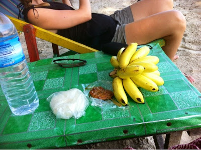Un petit marché de mets à disposition pour manger une petite brochette, un petit sac de sticky Rice, de l'ananas incroyable et un régime de banane (addiction totale aux bananes)